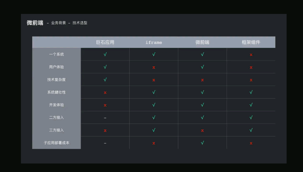 以spa/mpa为技术架构, 针对产品体验的场景,一个简单的 SPA 应用、肯定是能够给到一个整体的系统体验,并且能够管控系统的技术复杂度。但如果系统越来越臃肿,就会遇到上面到的技术纬度的问题