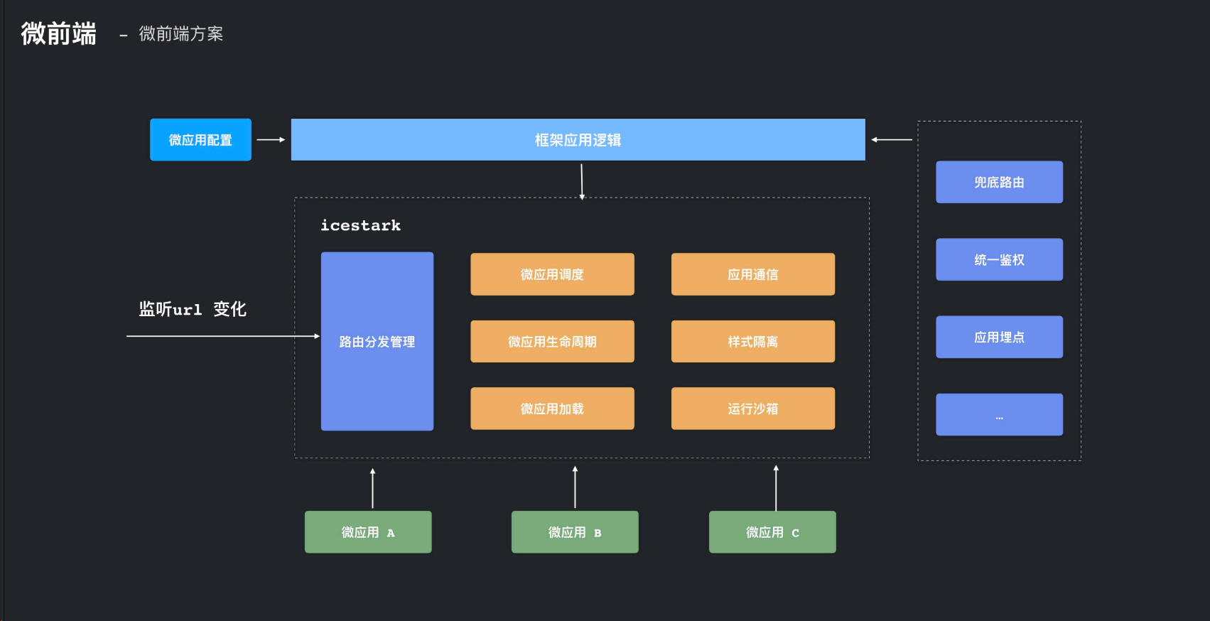 框架组件的方案,通常在一些通用的头部或吊顶逻辑共用的场景下。常用的逻辑封装成一个组件,其实就是以 npm 包的形式去引入进来。